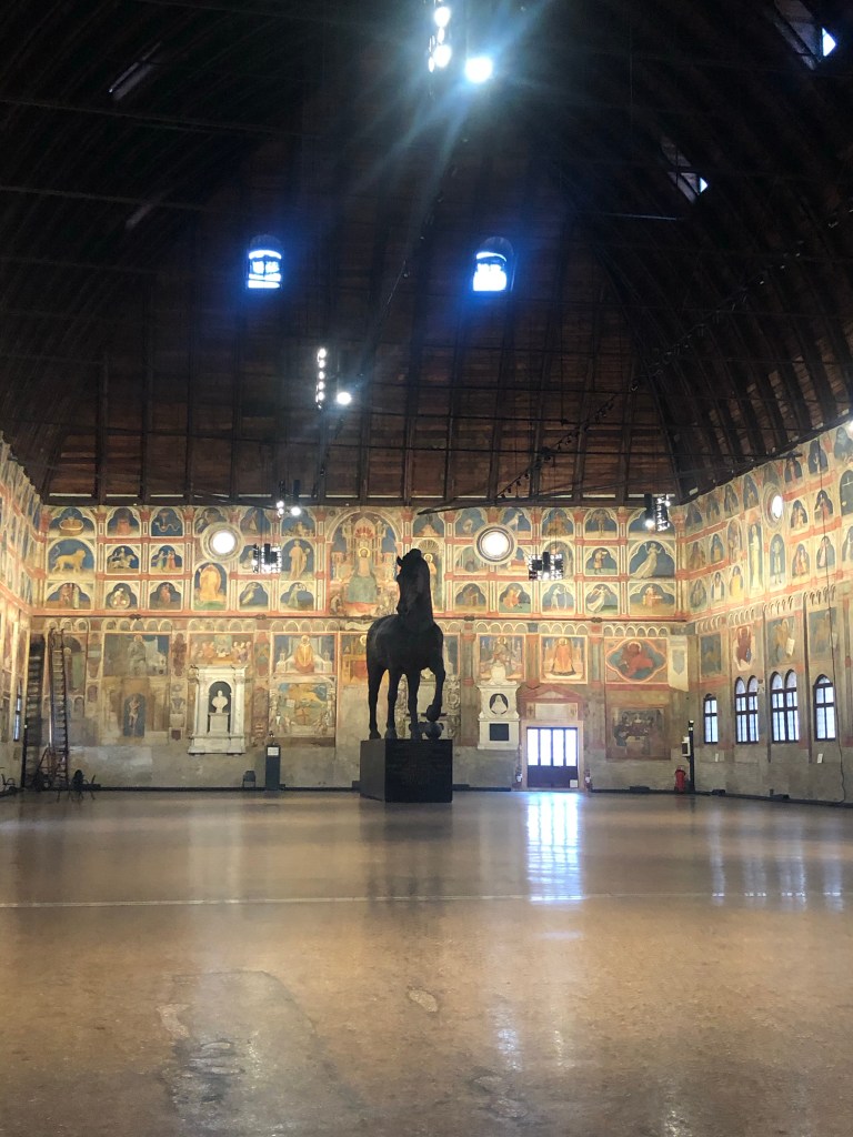 Viene chiamato anche “Il salone” poiché una volta varcata la soglia d’ingresso vi ritroverete in un unico ambiente lungo 80 metri e largo 27, completamente affrescato. Purtroppo un incendio nel 1420 distrusse gli affreschi precedenti opera di Giotto.